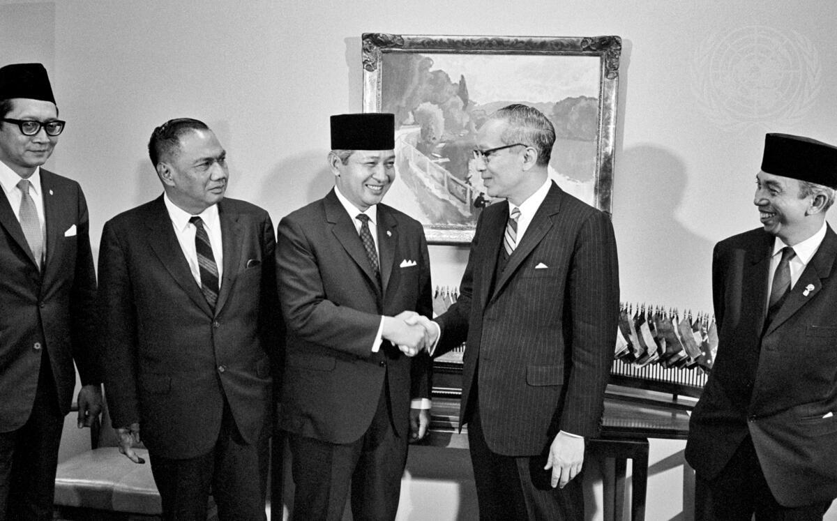 President Suharto shaks hands with Secretary-General U Thant. Left to right: Mr. Soedjatmoko, Ambassador of Indonesia to the United States; Hadji Roeslan Abdulgani, Permanent Representative of Indonesia to the United Nations; President Suharto; U Thant; and Adam Malik, Minister for Foreign Affairs of Indonesia.