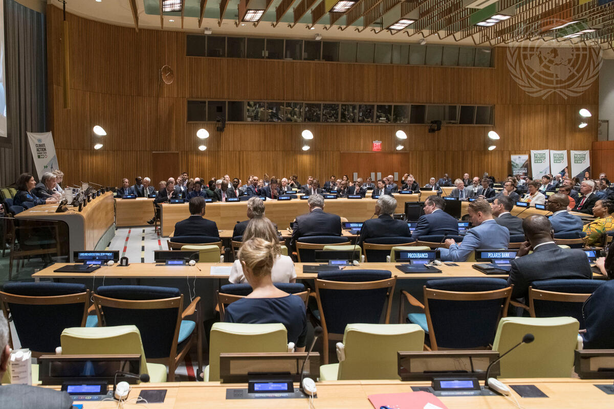 A wide view of the room as Secretary-General António Guterres (second from left at dais at left) makes remarks to the high-level event to launch the Principles for Responsible Banking.