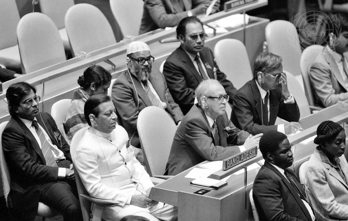Humayun Rasheed Choudhury (seated behind name plate), Minister for Foreign Affairs of Bangladesh, and Justice B.A. Siddiky (right), Permanent Representative of Bangladesh to the UN, surrounded by the members of the delegation of Bangladesh to the United Nations, attend the forty-first regular session of the General Assembly, at UN Headquarters in New York.