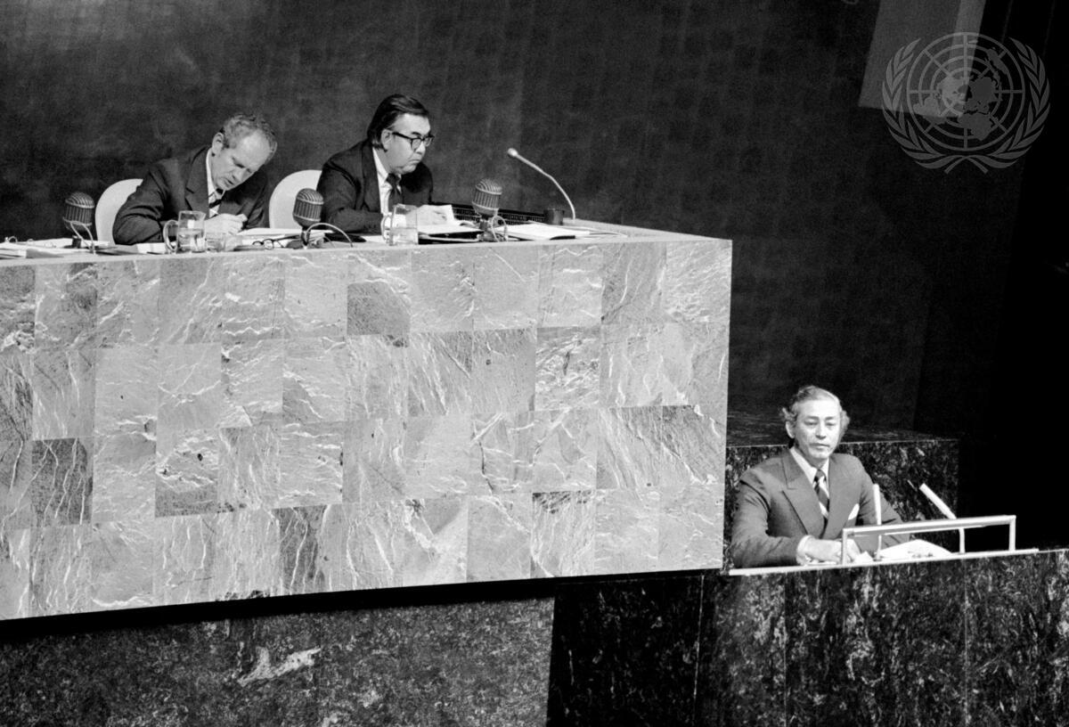 Raja Tridiv Roy, Minister of Minorities Affairs and Tourism of Pakistan, joins the general debate of the twenty-seventh session of the General Assembly. Seated behind him at the presidential rostrum are General Assembly President Stanislaw Trepczynski (Poland), and Bradford Morse, Under-Secretary-General for Political and General Assembly Affairs.