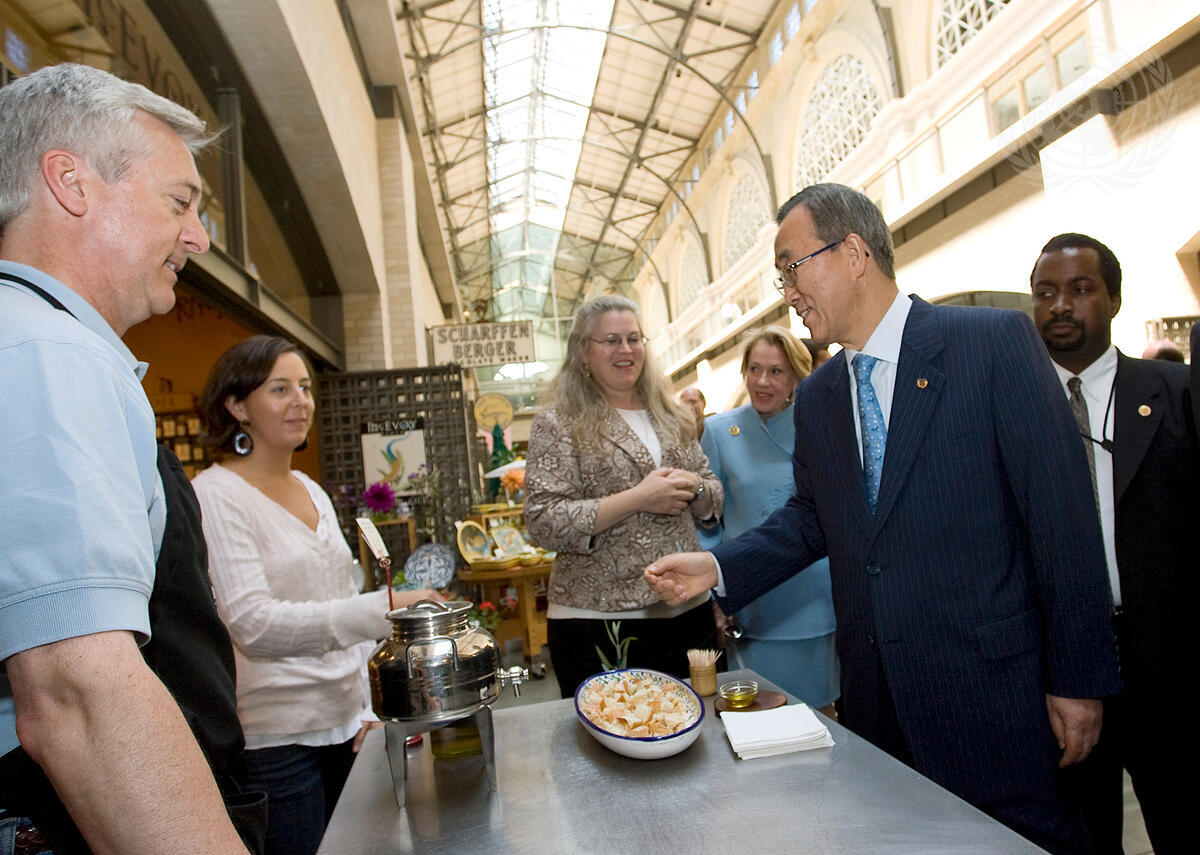 Secretary-General Ban Ki-moon (right) tastes some olive oil during a tour of the ferry building Marketplace in San Francisco, California.