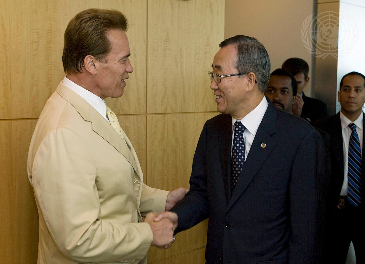 Secretary-General Ban Ki-moon (right ) meets with Arnold Schwarzenegger, Governor of California at the Echelon Corporation -- a green technology company in the city of San Jose, California.