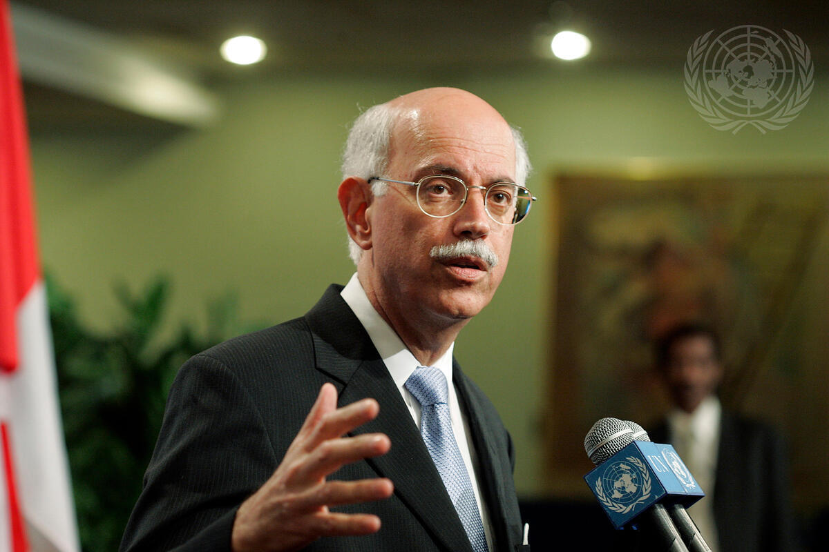 Andrew S. Natsios, United States (US) President's Special Envoy for Sudan, speaks to news correspondents outside the Security Council chamber, at UN Headquarters in New York.