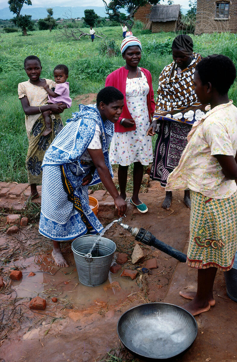 Village women obtaning drinking water from a newly installed water pipe in rural Tanzania. The UN Chindren's Fund (UNICEF) has assisted the Government of Tanzania in launching several rural water supply projects. 1980.