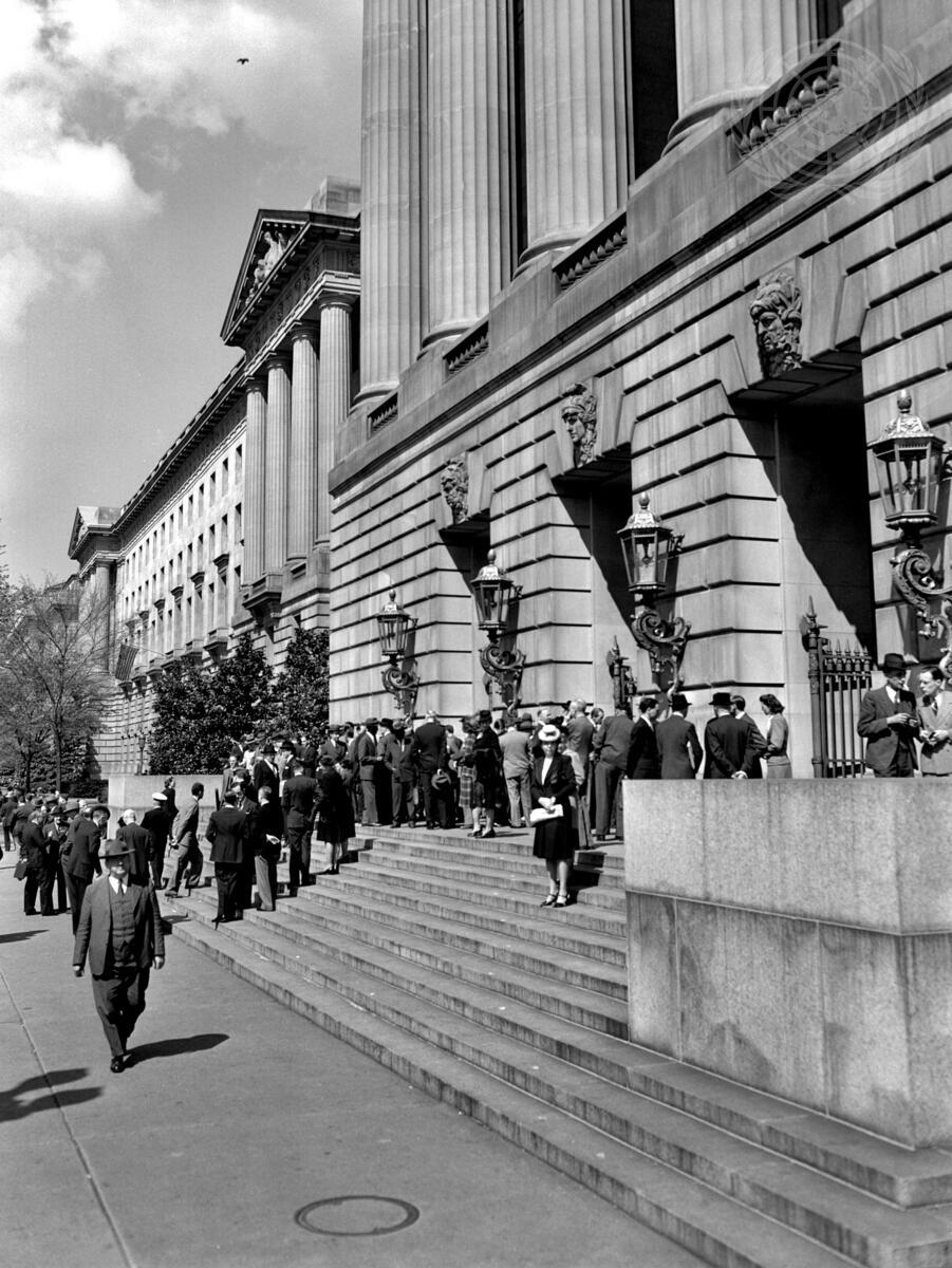Delegates and visitors outside the Inter-Departmental Auditorium in Washington, D.C. in April 1945, prior to the start of the San Francisco Conference.