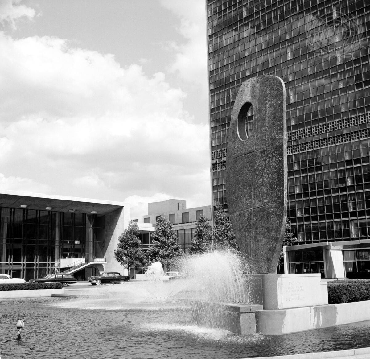 View of a 21-feet-high bronze sculpture given to the United Nations through a grant by the Jacob and Hilda Blaustein Foundation in memory of the late Dag Hammarskjöld. The abstract sculpture is titled ""Single Form"" and was executed by Barbara Hepworth, a British sculptress. It is mounted on a granite base at the circular pool facing the 38-storey Secretariat Building. The sculpture was unveiled on 11 June 1964 during a ceremony presided over by Secretary-General U Thant.