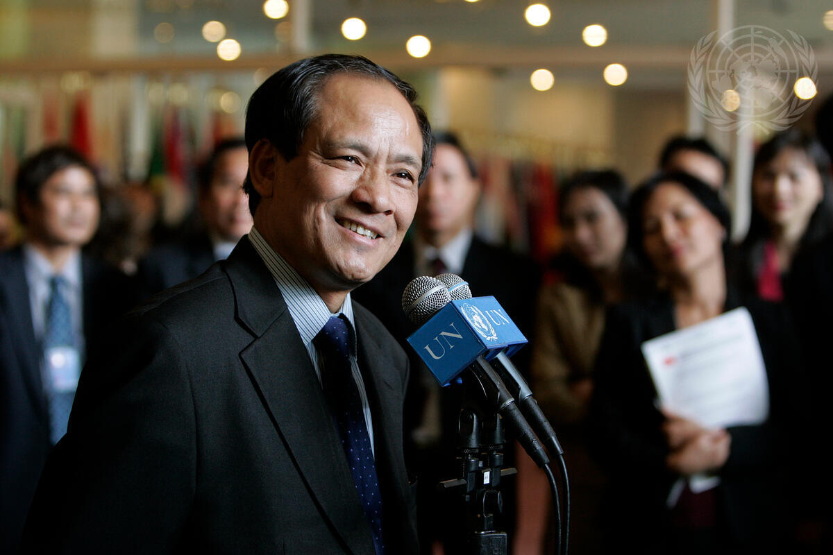 Le Luong Minh (at the microphone), Permanent Representative of the Socialist Republic of Viet Nam to the United Nations, speaks to correspondents outside the General Assembly hall after the election to a two-year term, of five non-permanent members of the Security Council, at UN Headquarters in New York.