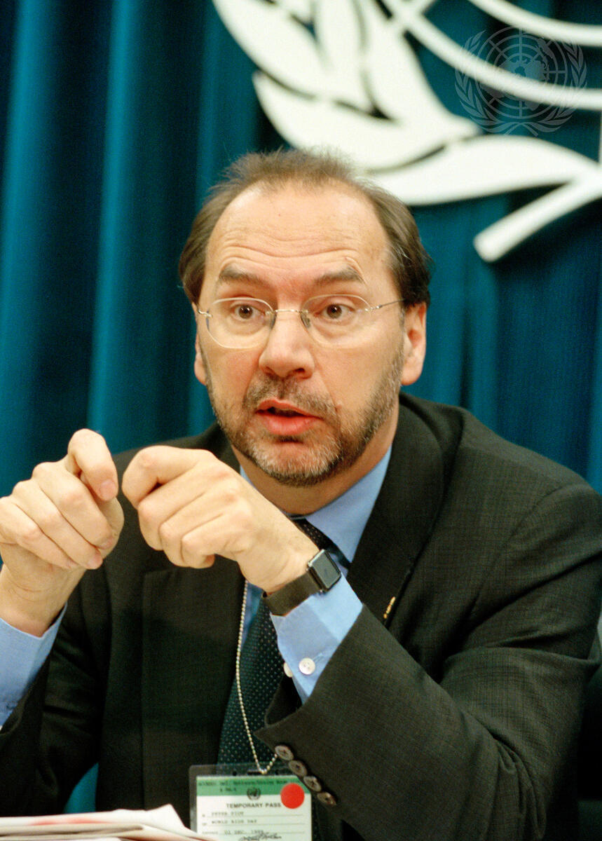 Dr. Peter Piot, Executive Director of the Joint United Nations Programme on HIV/AIDS (UNAIDS) briefs correspondents, as part of the World AIDS Day observance at United Nations Headquarters.