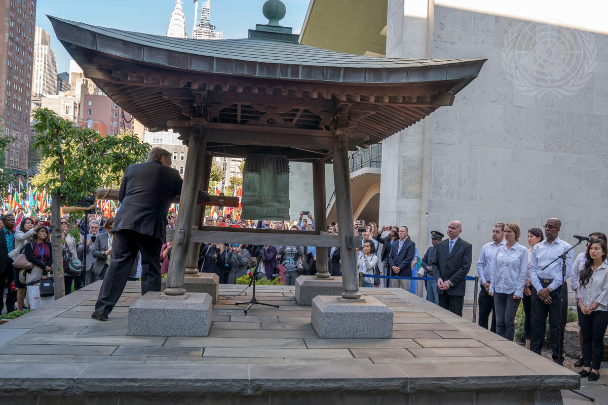 Secretary-General António Guterres rings the Peace Bell at the annual ceremony held at UN headquarters in observance of the International Day of Peace (21 September).
