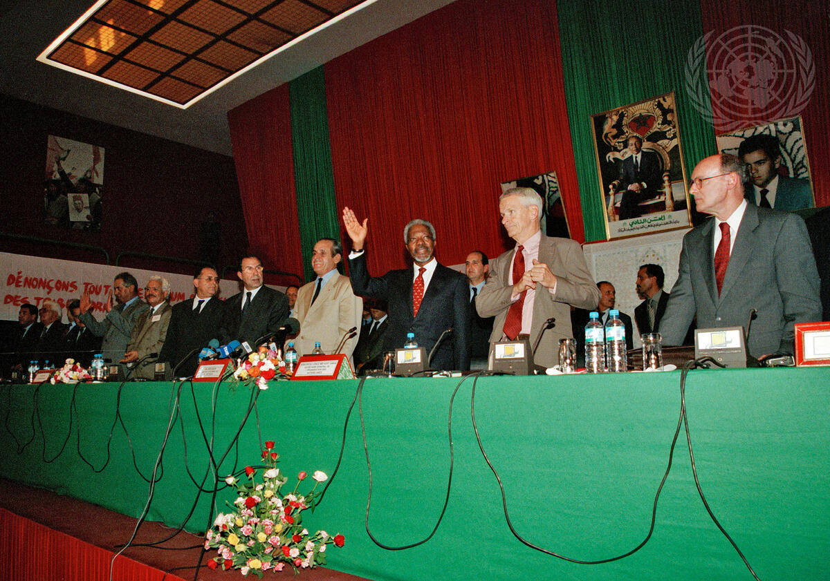 Secretary-General Kofi Annan (third from right) waves to those assembled for his meeting with Western Saharan Chiefs and other notables.