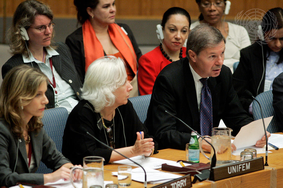 Jean-Marie Guéhenno (second from right, front row), Under-Secretary-General for Peacekeeping Operation, flanked by Joanne Sandler (second from left), Ad Interim Executive Director of the UN Development Fund for Women, and Gina Torry (left), Coordinator for the Non-Governmental Organization Working Group on Women, addresses the Security Council meeting on Women, Peace and Security, at UN Headquarters in New York.