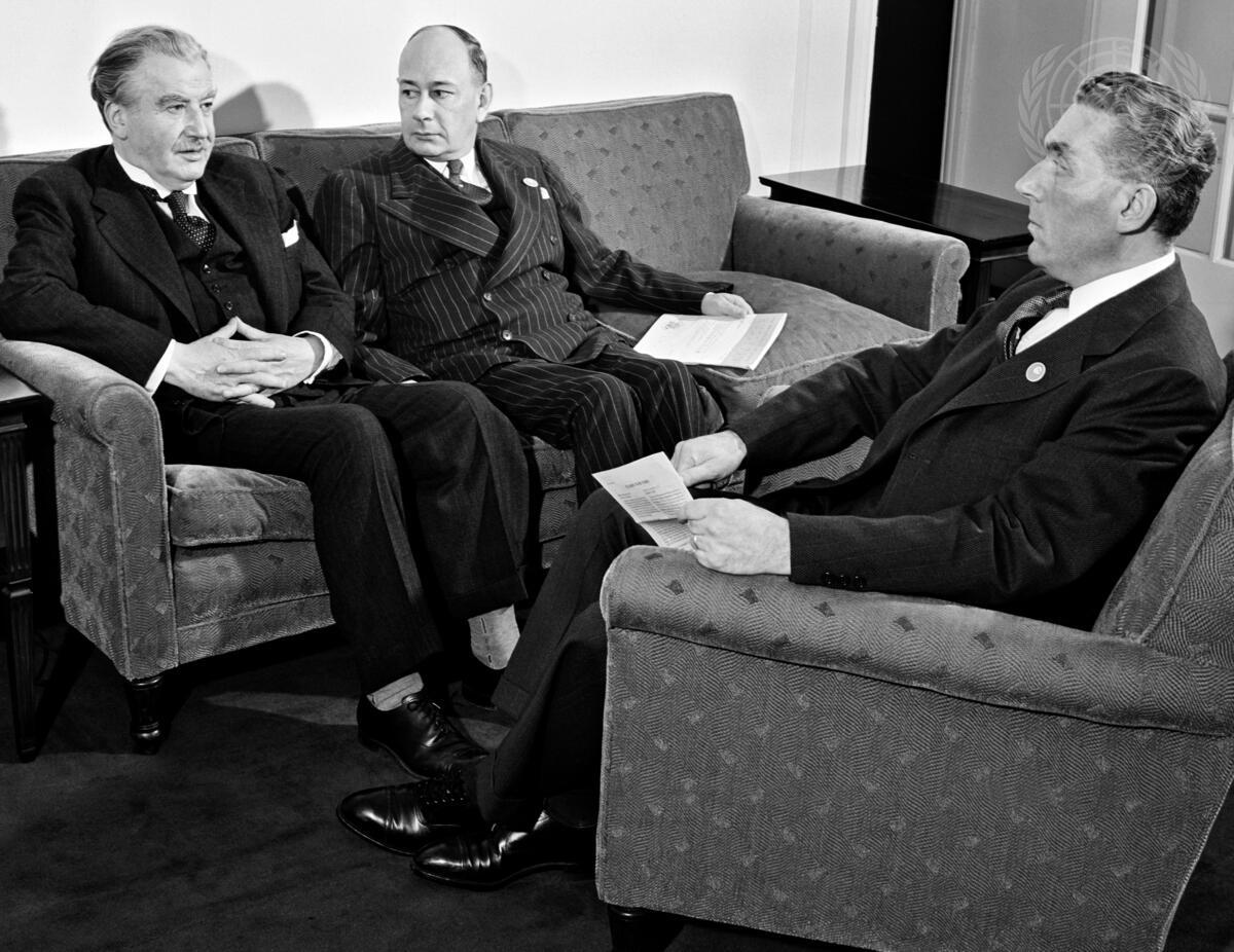 Left to right: Joseph Bech, Minister of Foreign Affairs and Chairman of the Delegation from Luxembourg, Huges Le Gallais, Minister to the United States, and Alphonse Als, Chief of Cabinet, Ministry of Foreign Affairs. [No exact date]