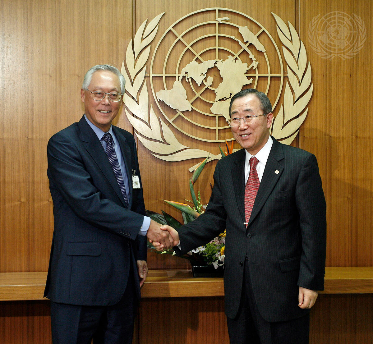 Secretary-General Ban Ki-moon (right) meets with Goh Chok Tong, Senior Minister of Singapore, at UN Headquarters in New York.