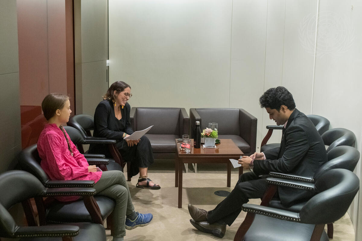 "Greta Thunberg (at left), Climate Activist, waits with Anurag Saha Roy (at right), Winner of the Summer of Solutions Pitch Competition; and Paloma Costa Oliveira, Lawyer and Climate Activist, behind the General Assembly Hall ahead of the opening of the UN Climate Action Summit 2019.