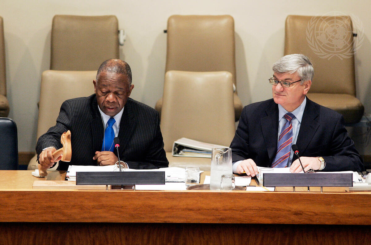 Boniface G. Chidyausiku (left), Permanent Representative of Zimbabwe to the United Nations, and Vice-President of the 61st session of the General Assembly, is presiding over the 91st plenary meeting of the Assembly during the discussion of the reports of the Legal Committee (Sixth Committee), at UN Headquarters in New York.