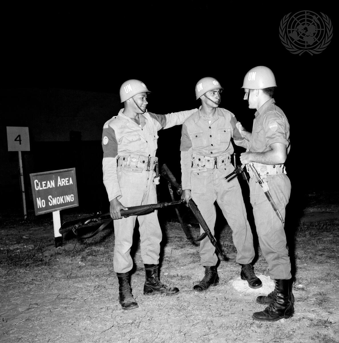 A Company of the Brazilian Battalion with UNEF in the Gaza Strip guards the UNEF Maintenance Area at Rafah. Private Alfredo Pereira Junior (right), a Brazilian soldier serving with this UNEF Company, is seen with two companions serving on night patrol duty. At night, the fence around the Maintenance Area is constantly patrolled. Each soldier must perform night duty 3 times a week.