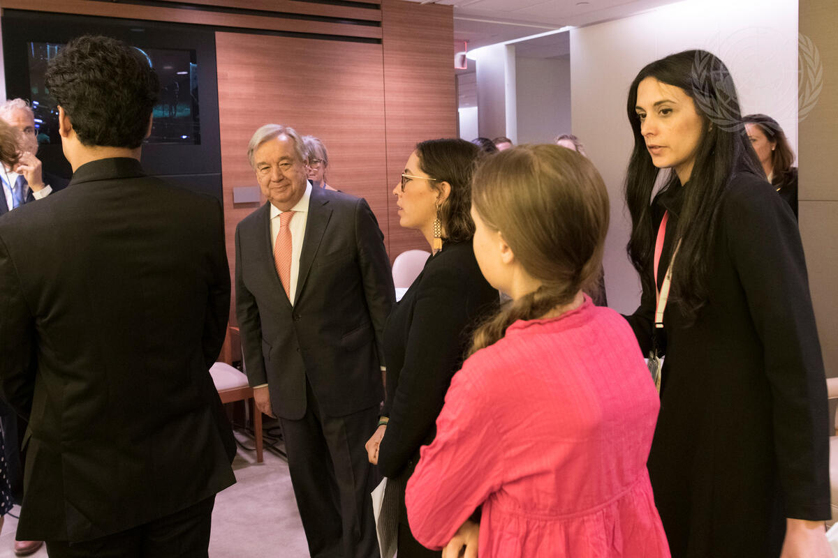 "Secretary-General António Guterres (second from left) smiles at Greta Thunberg (in front of camera), Climate Activist, ahead of entering the General Assembly Hall to hold the first panel during the UN Climate Action Summit 2019.
