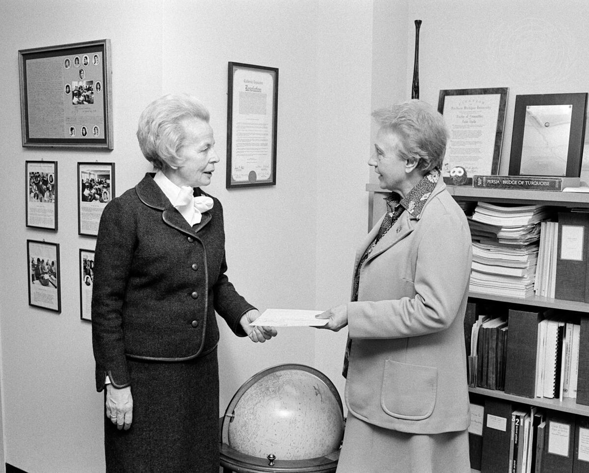 Ms. Doris Vaughn (right) , Representative of Zonta International at the UN, presenting to Mrs. Helvi Sipila, Assistant Secretary-General for Social Development and Humanitarian Affairs, a cheque for $500 for the UN Decade for Women. Zonta International, an organization of executive and professional women, is the first NGO to contribute to the voluntary fund for the UN Decade of Women.