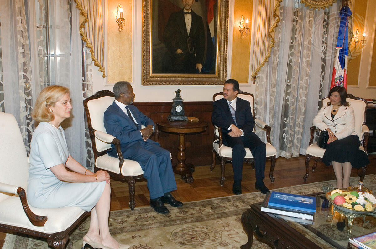 Secretary-General Kofi Annan visited Santo Domingo, Dominican Republic, where he met with President Leonel Fernández Reyna. Left to right: Mrs. Nane Annan; Mr. Annan; President Reyna; and Mrs. Margarita Cedeño de Fernández.