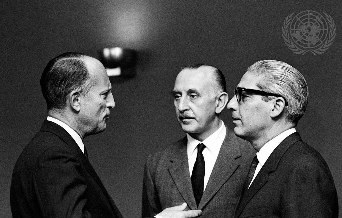 Conversing prior to the meeting are, from left: Ambassador J.G. de Beus, Permanent Representative of the Netherlands to the UN, Mr. Giuseppe De Rege, Minister Plenipotentiary, Head of UN Department in the Italian Ministry of Foreign Affairs, and Ambassador Piero Vinci, Permanent Representative of Italy to the UN.