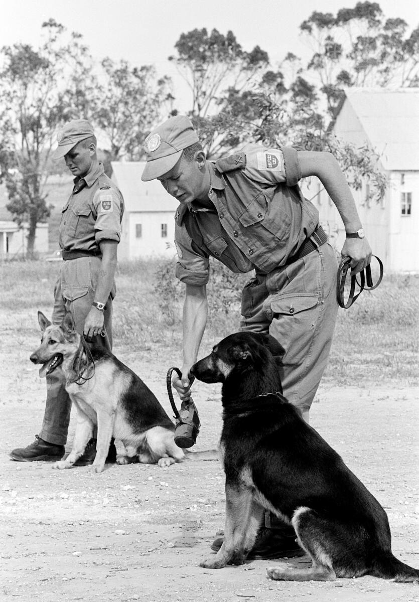 Sentry dogs training at UNFICYP Famagusta Zone Headquarters, Swedish Battalion. Seen here are Pte. Jorgen Svensson (foreground) of Sweden with ""Tell"", and Pte. Brynolf Andersson of Sweden with ""Kant"".