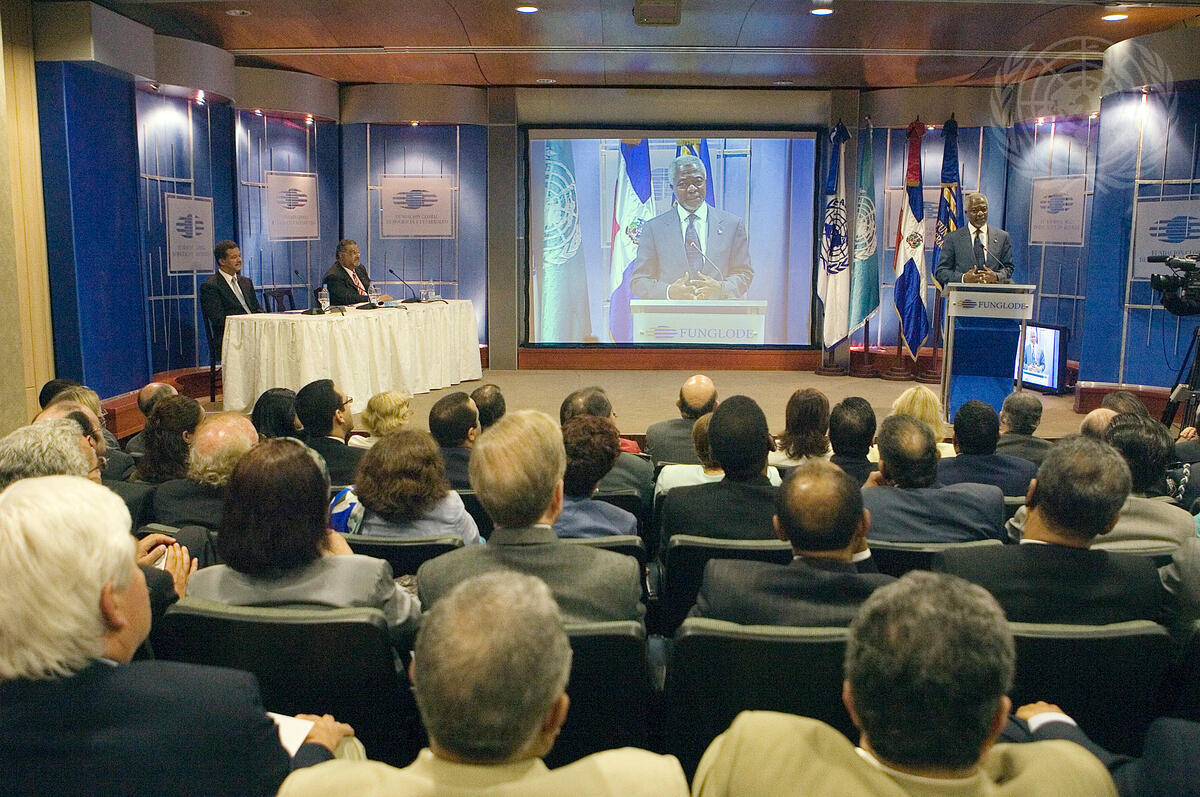 Secretary-General Kofi Annan (right) speaking at the office of the Global Foundation for Democracy and Development (FUNGLODE) in Santo Domingo, Dominican Republic.