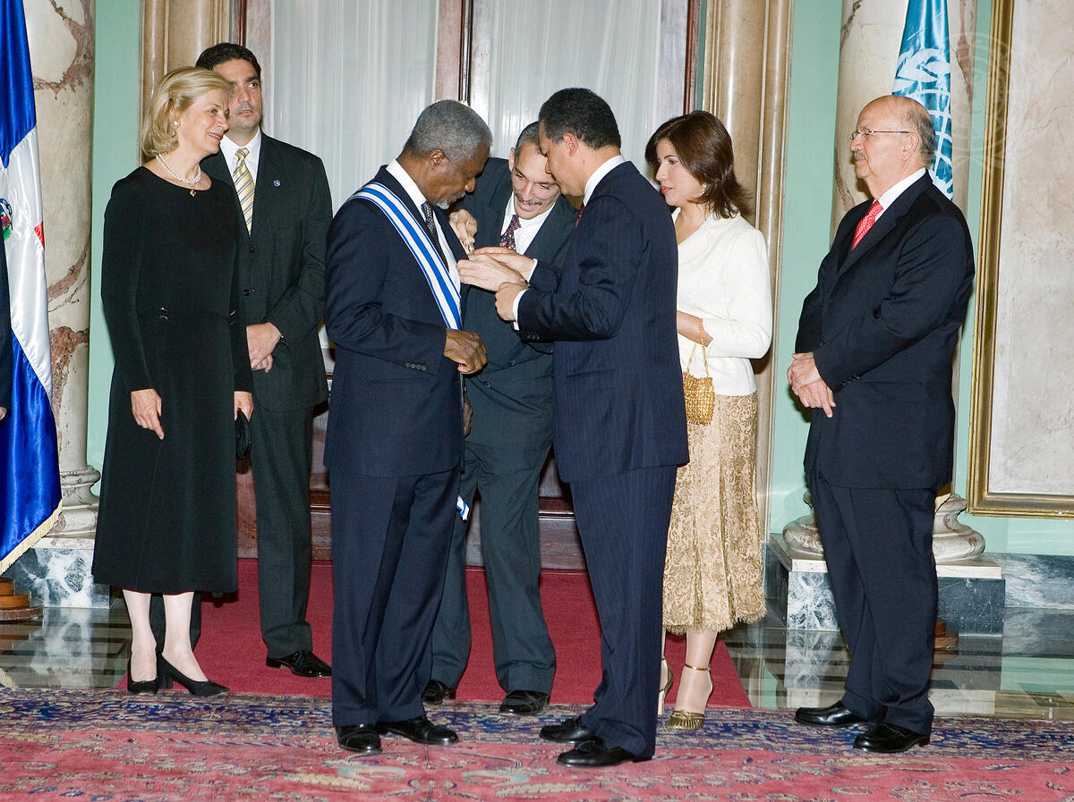 Secretary-General Kofi Annan (centre, left) was conferred the Order of Merit of Duarte, Sanchez and Mella (Orden al Mérito de Duarte, Sánchez y Mella) by Dominican President Leonel Fernández Reyna (centre, right) at the National Palace in Santo Domingo, Dominican Republic.