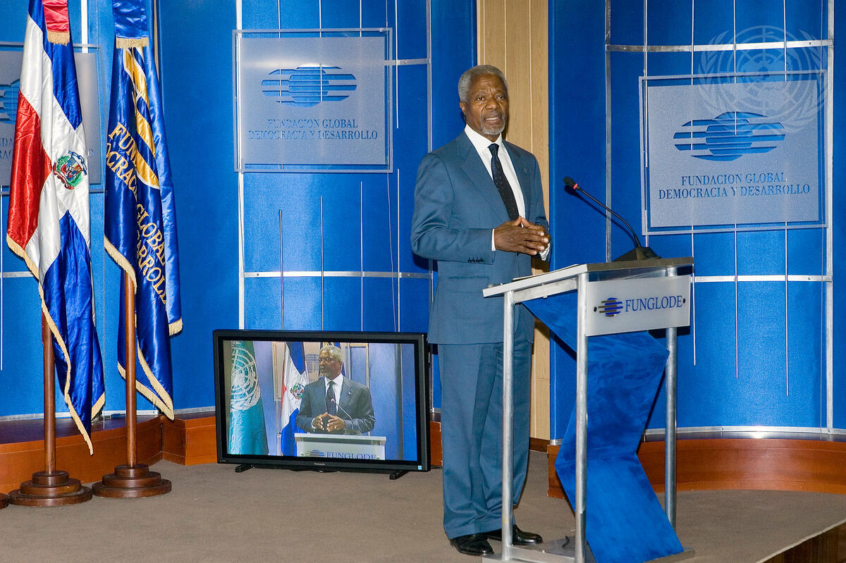 Secretary-General Kofi Annan speaking at the office of the Global Foundation for Democracy and Development (FUNGLODE) in Santo Domingo, Dominican Republic.