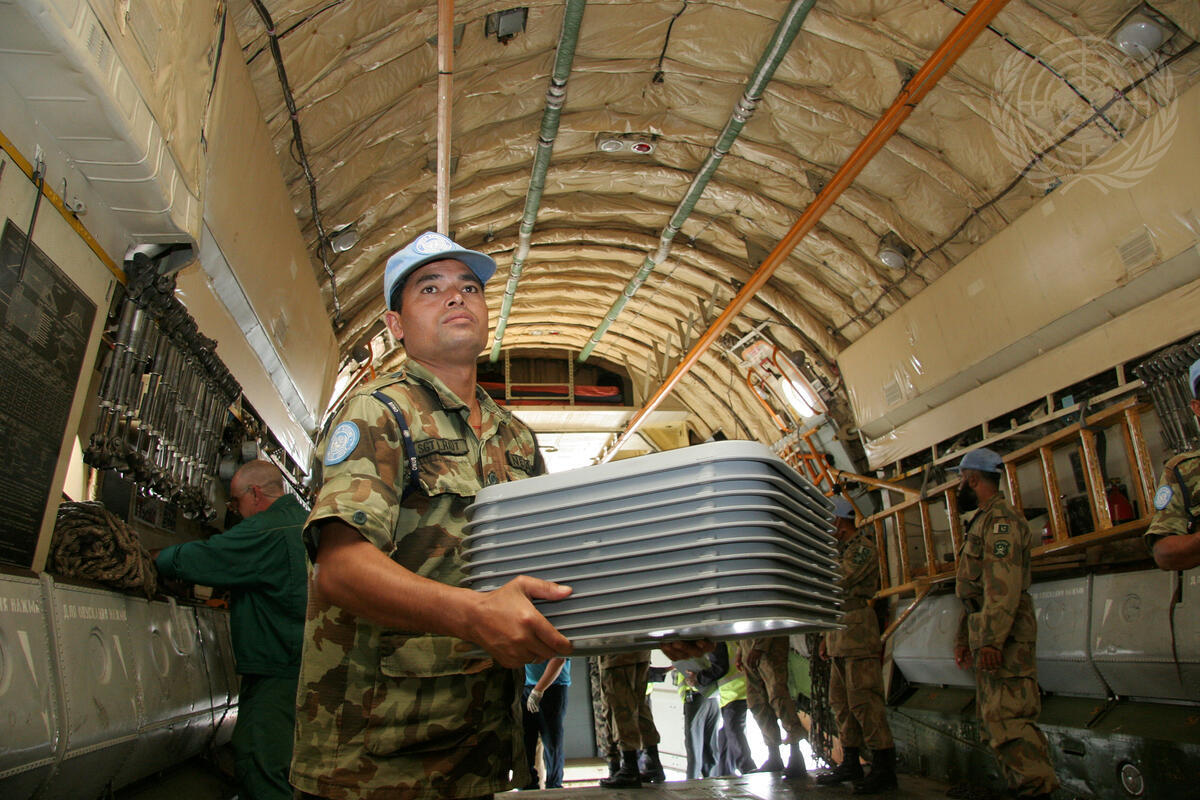 A United Nations Operation in Burundi peacekeeper loads ballot boxes into an airplane that are to be air-shipped to Kinshasa, Democratic Republic of the Congo.