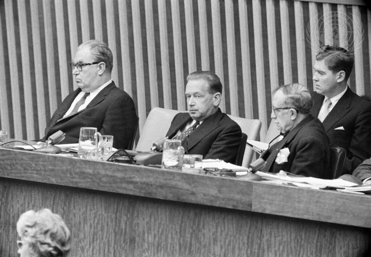 Listening to the speakers in the general debate, are (left to right, front row): Sir Leslie Munro (New Zealand), UN Special Representative on Hungary; UN Secretary-General Dag Hammarskjöld; and Dr. Victor A. Belaunde (Peru), President of the Assembly.