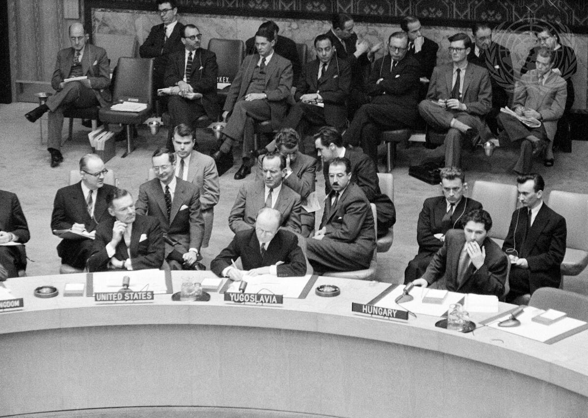 This picture shows, seated at the Conference table (left to right): Mr. Henry Cabot LODGE, Jr., U.S. Representative to the UN; Mr. Joza BRILEJ, of Yugoslavia; and Dr. Janos SZABO, of Hungary.