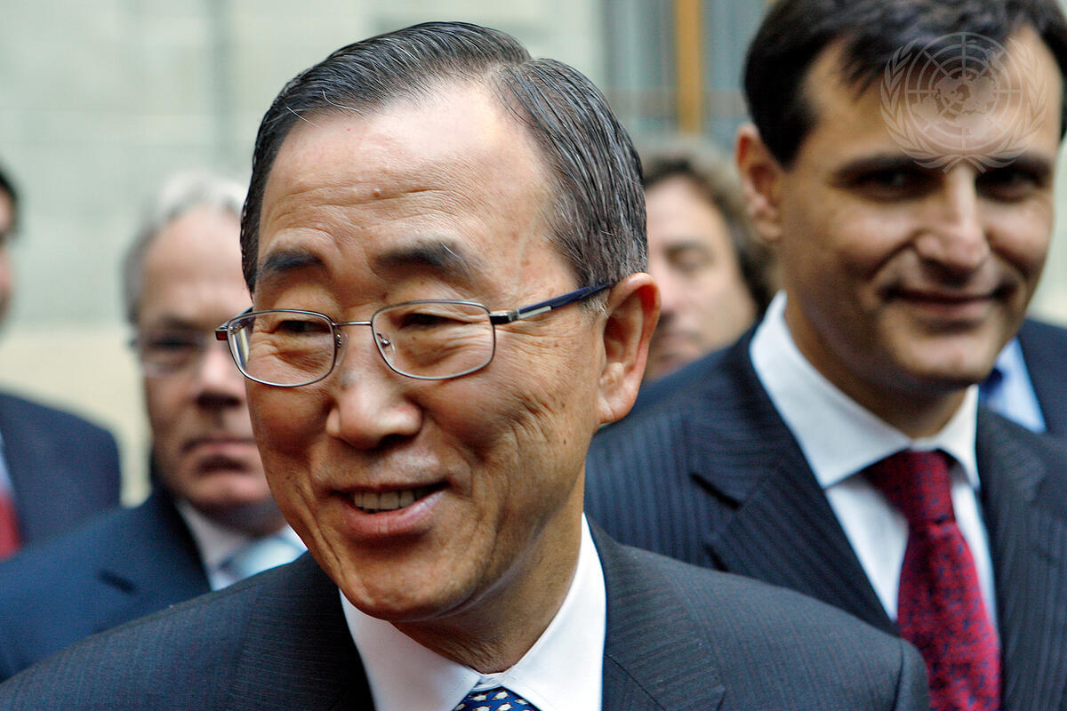 Secretary-General Ban Ki-moon speaks to journalists before signing the ""Golden Book"" with Charles Beer (back right), President of the State Council of Geneva, in Switzerland.