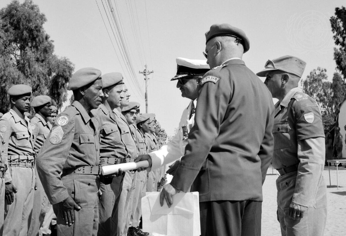 Here, during the ceremonial farewell parade, Gen. Burns (white uniform) presents to Sgt. Nimes a diploma from the Brazilian Government for outstanding work in UNEF. With Gen. Burns are Col. V.L. Schilling (l.), Brazilian Liaison Officer with UNEF HQ, and Lt. Col. J.C. Ruy, Commanding Officer of the Brazilian Battalion.