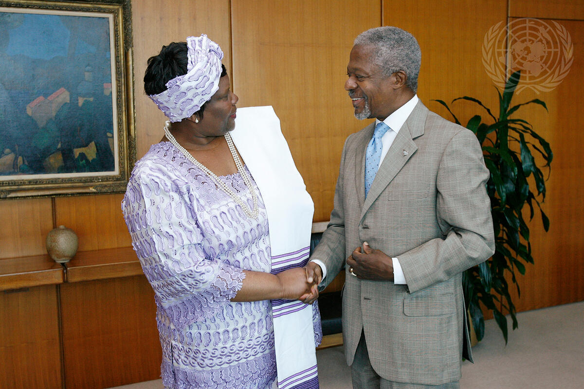 Secretary-General Kofi Annan (right) shakes hands with Judith Mbula Bahemuka, Permanent Representative of Kenya to the United Nations, who paid a farewell call on Mr. Annan, at UN Headquarters in New York.