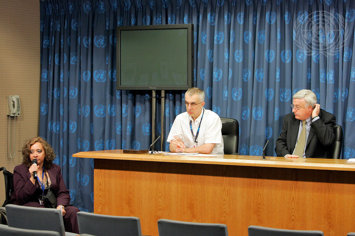 Maria Veronica Reina (left), President of the Center for International Rehabilitation (CIR) in Argentina, briefs correspondents on the Convention on the Rights of Persons with Disabilities, at UN Headquarters in New York. Left to right: Ms. Reina; Eduardo Bellando of the Department of Public Information; and Don MacKay, Permanent Representative of New Zealand to the United Nations.