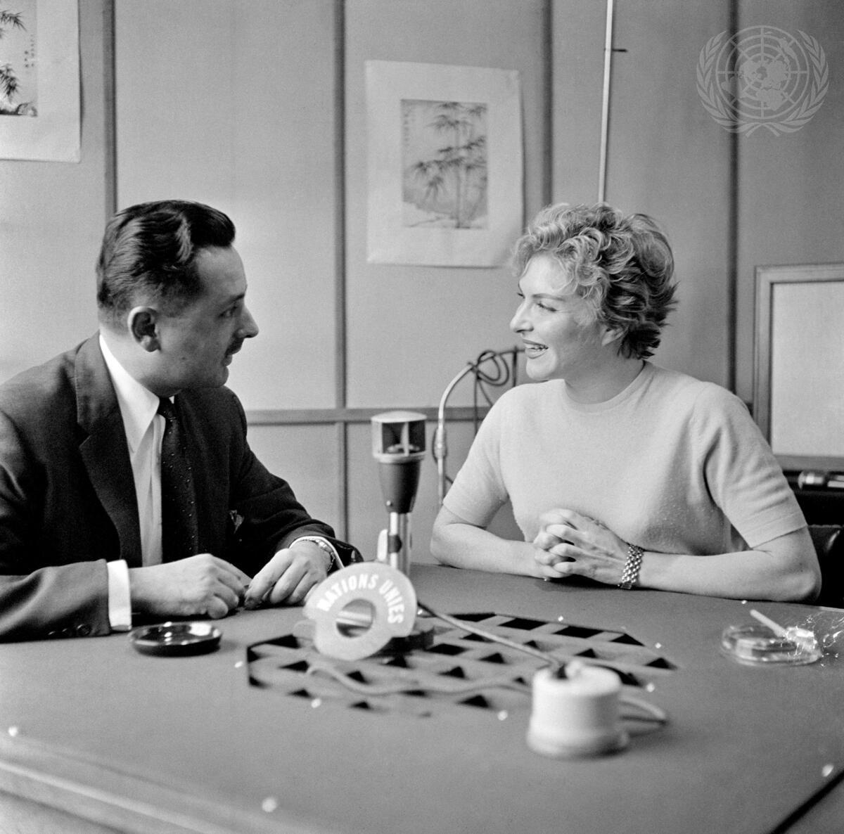 Miss Line Renaud, French actress and singer, interviewed for UN Radio by Mr. Roger Minne, U.N. Radio and TV Information Officer in Geneva. Miss Renaud visited the Palais des Nations and attended the current Conference on the Law of the Sea.