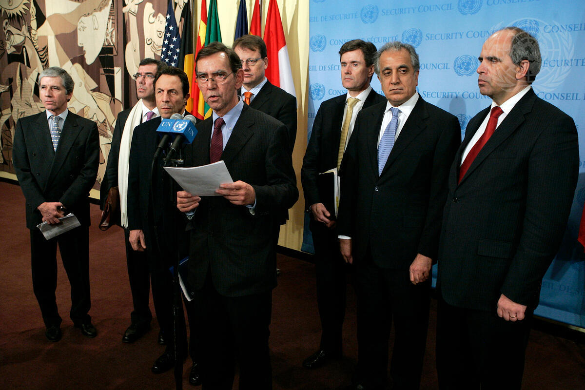 Johan C. Verbeke (centre, at the microphone), Permanent Representative of Belgium to the United Nations, reads a press statement on the situation in Kosovo.