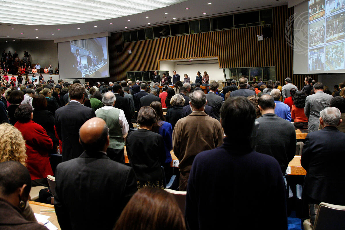 A wide-view of UN staff observing a moment of silence as a tribute to colleagues who died in the service of the United Nations in 2007.