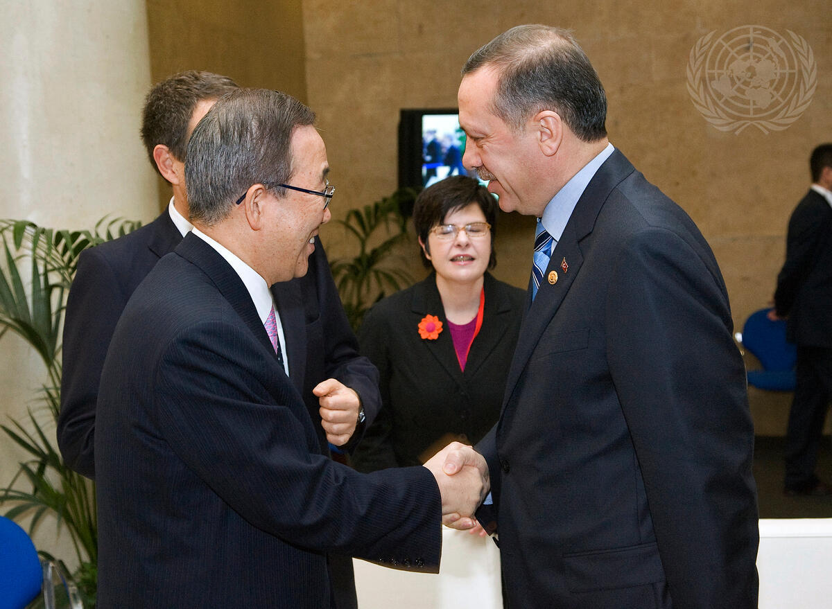 Secretary-General Ban Ki-moon (left) shakes hands with Recep Tayyip Erdogan, Prime Minister of Turkey, prior to the opening of the Alliance of Civilizations Forum.