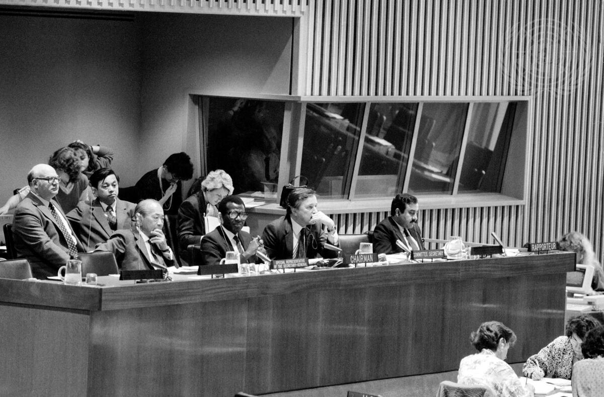Sitting at the head table of the Special Political Committee are (l. to r.): F.T. Liu, Under-Secretary-General, Office of the Under-Secretaries-General for Special Political Affairs; Kwam Kouassi (Togo), Chairman; Gustav Ortner, Director, Security Council and Political Committees Division; and Ahmed Khan (Bangladesh), Rapporteur.