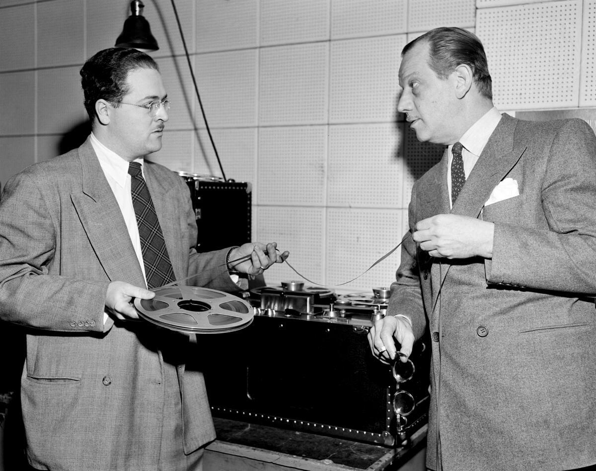 Film star Melvyn Douglas, right, discusses tape recording methods with U.N. engineer, during his visit to U.N. Headquarters to narrate U.N. documentary broadcast, ""Eye-Witness"" - a round-up of favourite stories covered by U.N. radio reporters.