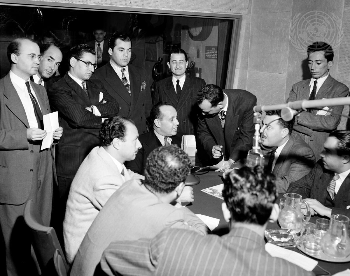 H.E. Dr. Mohamed Salah-El-Din Bey (Seated, behind microphone), Minister for Foreing Affairs and Chairman of the Egyptian Delegation to the fifth session of the United Nations General Assembly, is interviewed by a group of Middle-East correspondents over U.N. Radio facilities.