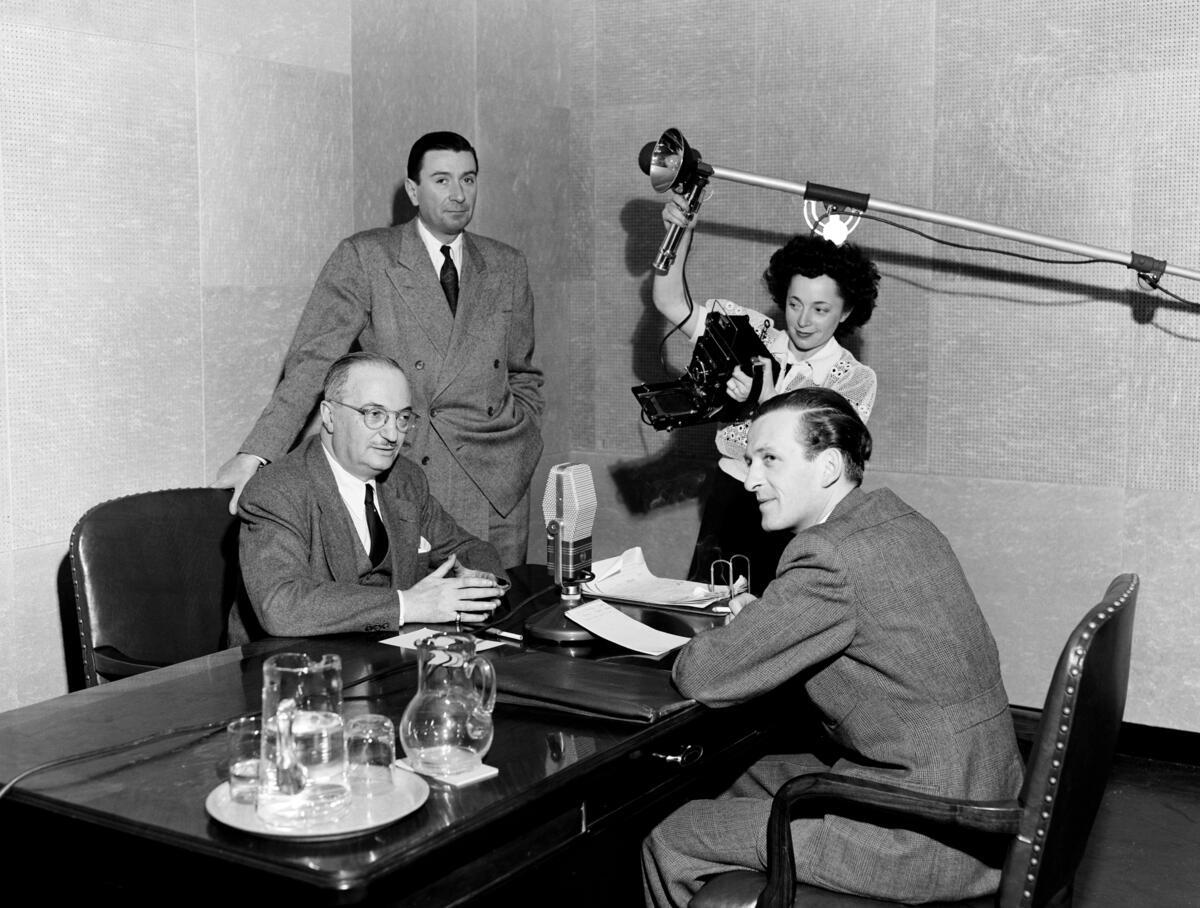 Jean Benoit-Levy (left), Director of the U.N. Films and Visual Information Division, is interviewed by Pierre Crenesse (sitting opposite), Director of Radio Diffusion Française for North America, during broadcast to France. Standing is Paul Bouchon, Chief of French Section of UN Radio Division, and Maria Bordy, U.N. Official Photographer.