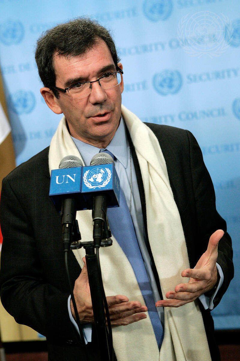 Jean-Maurice Ripert, Permanent Representative of France to the United Nations, briefs news reporters.
