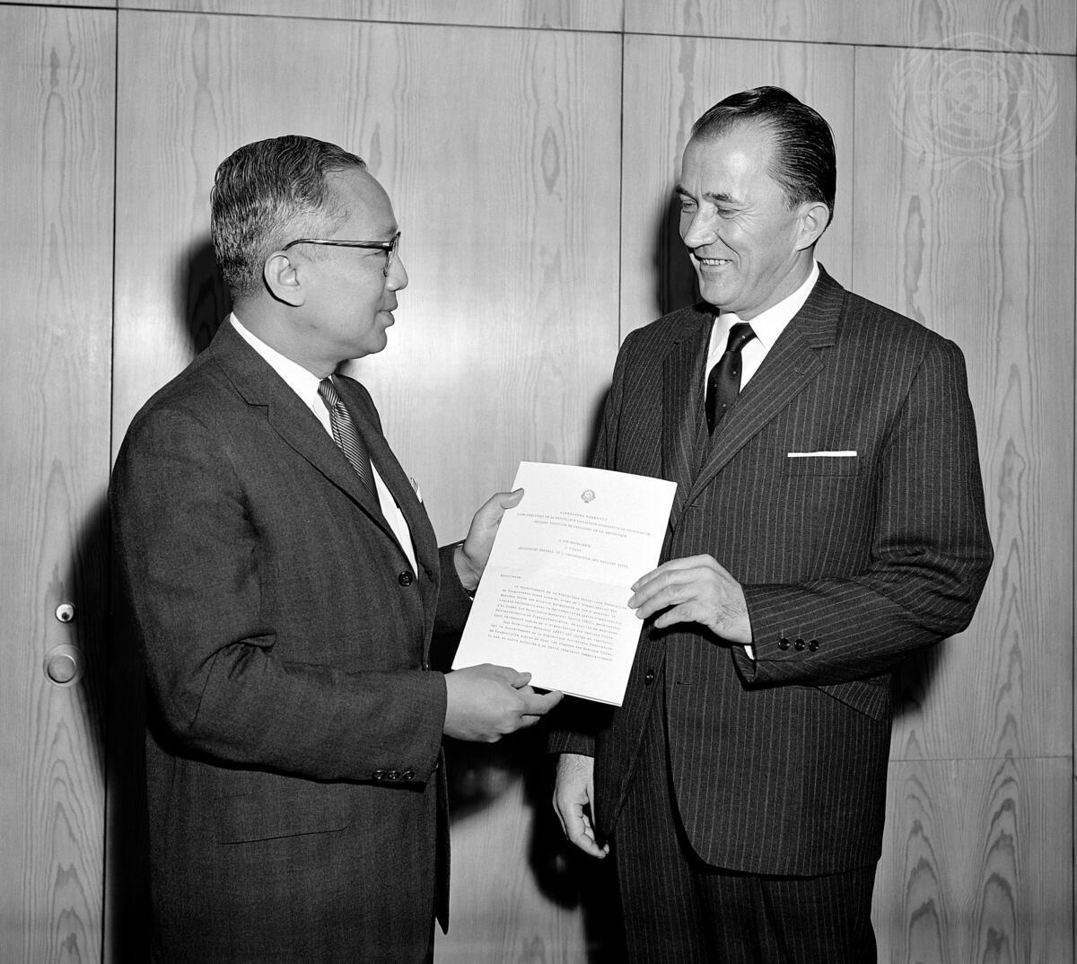 Mr. Danilo Lekic (right), the new Permanent Representative of Yugoslavia to the United Nations, is seen here as he presented his credentials to Secretary-General U Thant, this morning.