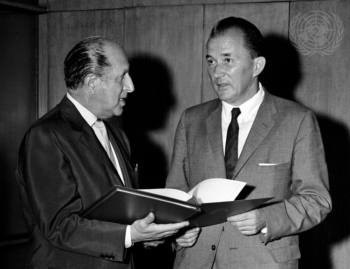 Mr. Danilo Lekic (right), Permanent Representative of Yugoslavia, is seen depositing with Mr. Constantin A. Stavropoulos, United Nations Legal Counsel, the instruments of accession and ratification.