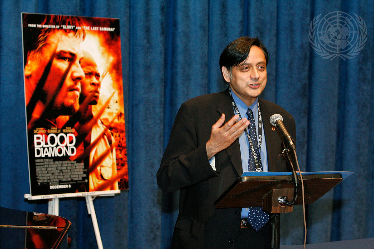 Shashi Tharoor, Under-Secretary-General for Communications and Public Information (DPI), speaks at the special screening of the film ""Blood Diamond"", organized by the Permanent Mission of Canada to the United Nations, with the support of Amnesty International, the Office of the Special Representative of the Secretary-General for Children and Armed Conflict and the Outreach Division/DPI, at UN Headquarters in New York.