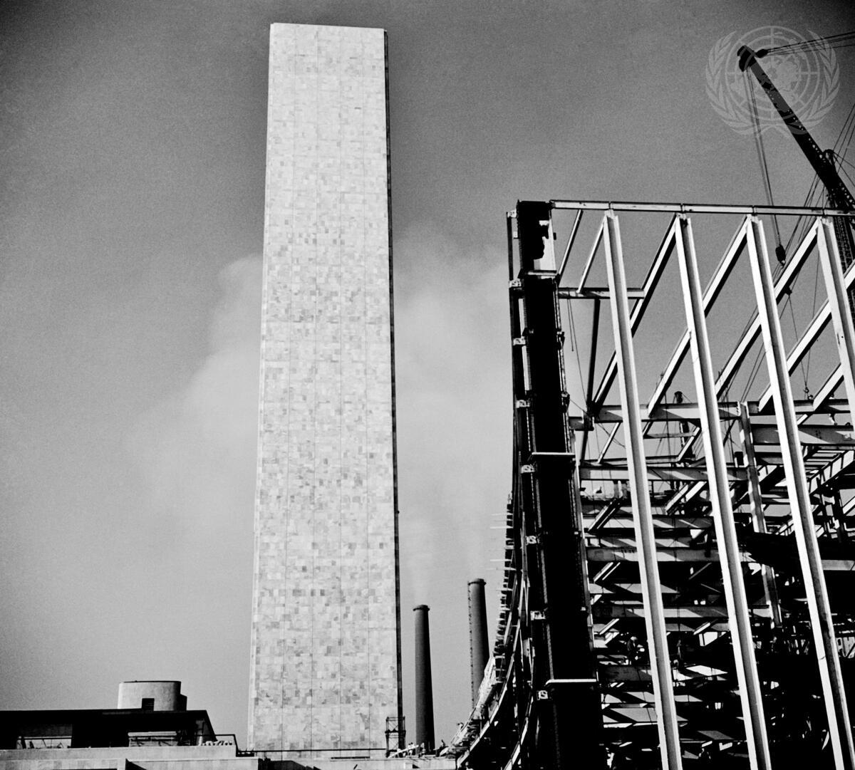 The towering Secretariat building and the steel structure of the General Assembly Hall, presently under construction, as seen from the northern part of the United Nations site in New York.