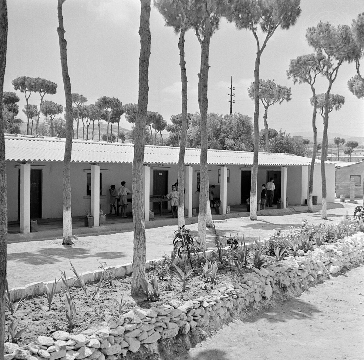 This picture shows refugee school children using the newly built UNRWA/UNESCO school in Dekwani camp near Beirut, Lebanon, as a social center during the vacation period. Gardens in foreground are tended by the school children. Proceeds from the sale of flowers in Beirut may add a few more uniforms to the School Scout Group.