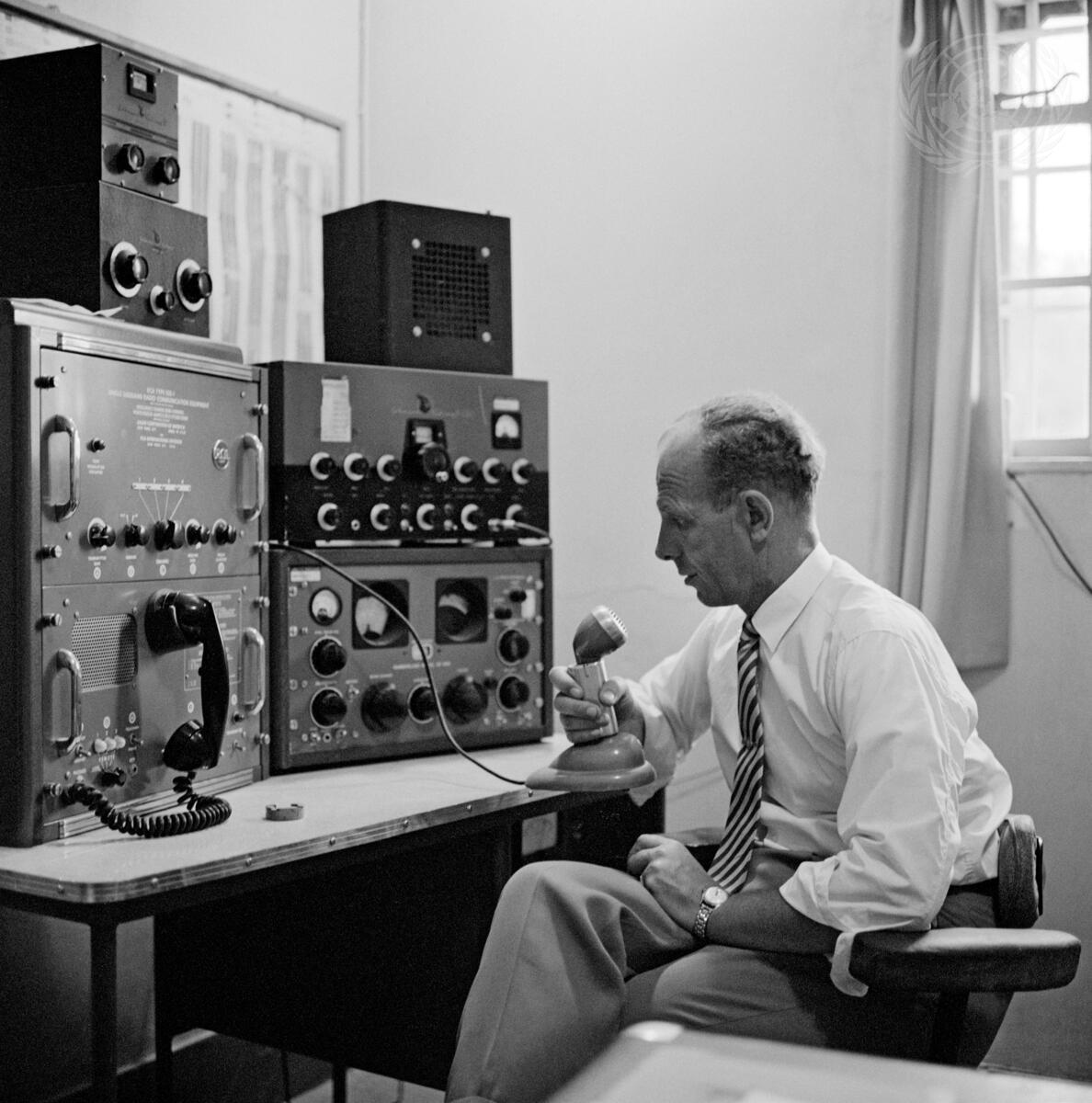 The United Nations Truce Supervision Organization (UNTSO) observes the maintenance in Palestine of the cease-fire, and assists the parties to the armistice agreements in the supervision of the application and observance of the terms of those agreements. A corps of UN Military Observers (UNMO) is available to assist in investigating any complaints. Radio Officer E. Michasen, Chief Communications Officer, at UNTSO Headquarters at Government House.